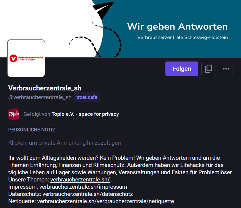 Die übrigen Social-Media-Plattformen zeigen große Marketing-KPIs. Diese prägen die Branche von Anbeginn der Kommerzialisierung des Internets. Sie sind die Rechtfertigung der Kosten, die sie verursachen, aber was ist wirklich der Nutzen. Das Profil @verbraucherzentrale_sh hat ca. 3.200 Follower auf Mastodon – vernichtend gering gegen die Zahl der Nutzenden auf Instagram. Doch auf Linkedin hat die Organisation sogar nur 519 Follower. Und trotzdem verabschieden sich die Verantwortlichen von Mastodon – warum?