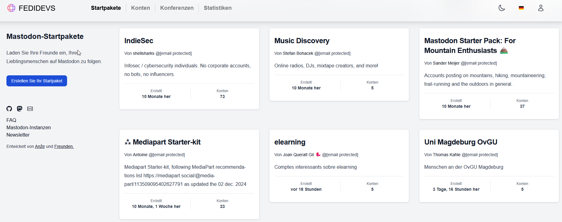 Mastodon arbeitet bewusst ohne Algorithmen, die Nutzenden Profile oder Inhalte vorschlagen. Das hat Vorteile – etwa mehr Kontrolle über die eigene Timeline – aber auch eine Hürde: Wer neu startet, muss sich sein Netzwerk selbst aufbauen. Genau hier setzen Profil-Starterpacks an. Plattformen wie Fedidevs bieten kuratierte Listen von Profilen zu bestimmten Themenbereichen. Nutzer:innen können sich ein Starterpaket aussuchen, das zu ihren Interessen passt, und erhalten so sofort eine gefüllte Timeline mit relevanten Kontakten.
